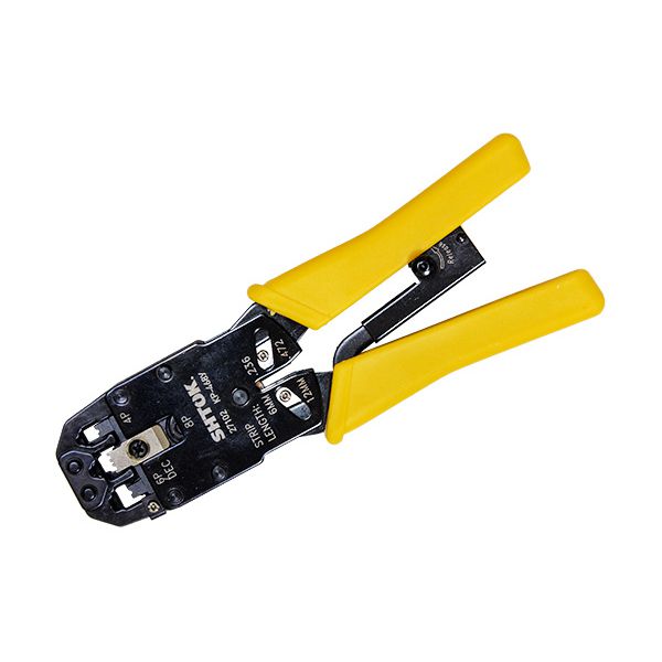 Двухкомпонентные рукоятки универсального кримпера для телефонных и компьютерных разъемов SHTOK 27102 КР-468У обеспечивают комфорт в работе без скольжения."