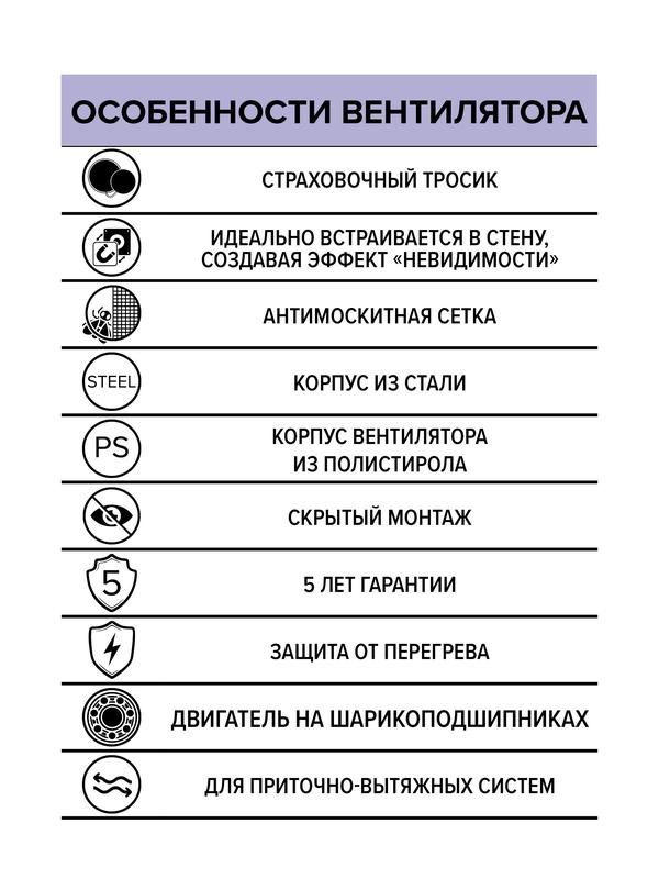 • Никаких насекомых и пыли: встроенная антимоскитная сетка защитит помещение от насекомых из вентканала